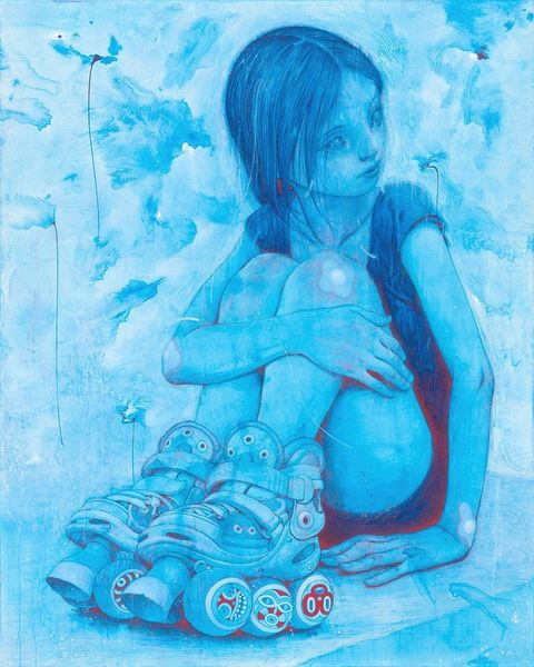 Mikuláš Medek’s Action I (Egg) presents a figure painted entirely in shades of blue holding an egg. It looks like the paint has been layered to create that depth of colour. I’m interested in that egg, though, and what it is doing in the hand of this figure. The paint here is quite thin, almost transparent, allowing the canvas texture to peek through, which makes the surface come alive, especially in the figure's face. Medek's brushwork is delicate, and look at how the colour pools around the edges of the figure, creating a soft, dreamy effect. It’s as if the figure is emerging from the blue. This piece reminds me of Giorgio de Chirico, who played around with dreamscapes and that idea of something emerging. This is an invitation to consider the layers of meaning and feeling that art can evoke, embracing the beauty of ambiguity over easy answers.