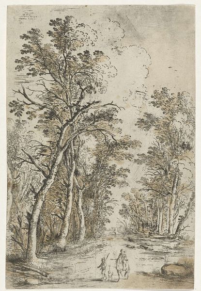 Curator: Today, we'll examine Jan Fouceel's etching, "Bospad," believed to have been created between 1665 and 1675. It's a fascinating example of Dutch Golden Age landscape art. Editor: Wow, that's... intricate. All those lines! It's like a whisper of a forest, barely there, but so evocative. Makes you want to walk right in and get lost, doesn't it? Curator: Indeed. Note how Fouceel uses etching techniques to build depth. The density of lines varies to create contrast, defining forms, especially within the cluster of trees to the left. Editor: The composition is lovely too; it's like peering through a screen of trees. It feels so contained yet leads to this dreamy vanishing point in the background. See those figures on the path? Tiny humans going somewhere far. It is poetic! Curator: Precisely! The scale of the figures enhances the sublime effect of nature, placing humans within its immensity. The linear quality also invites contemplation. Note the use of stark lines to delineate each tree and its branch structure. Editor: Right! Like a meticulous botanical drawing, except wilder, moodier. I mean, the stark contrast between the detailed trees and the blurred, hazy horizon intensifies this feeling of being inside and outside simultaneously. The mood here is wistful; don't you think? Curator: I perceive the piece as formally controlled in its approach, though certainly, a range of readings is possible. Considering period conventions, it's fascinating to observe Fouceel using light and shade to mold the organic forms, demonstrating keen observational capabilities. Editor: Fair enough, but to me, that "formal control" allows our modern imagination to run wild. Maybe because of what he omitted, or suggested... you start filling in the colors, smells, and rustlings. Art is, in many cases, the completion of work in the mind of the beholder. Curator: Well articulated. Thank you for expanding our understanding through your intuitive observations. Editor: Likewise! Always a treat to stroll through a digital forest with you.