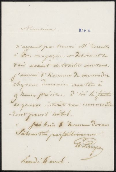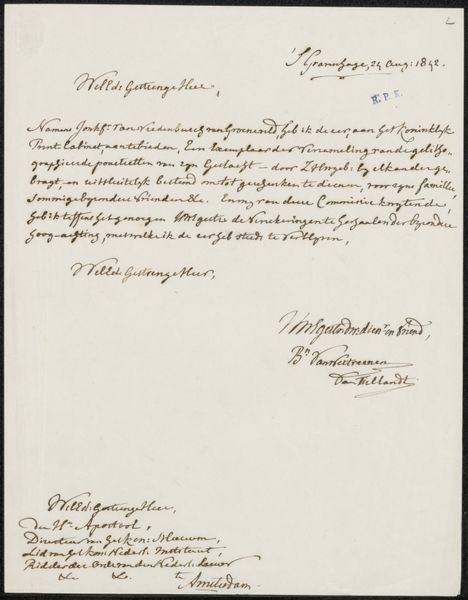 This is a letter, penned in Brussels on April 26th, 1847, by Jean Baptiste Van Eycken. It's written with iron gall ink –the standard writing medium for centuries– on a paper that would have been made from pulped rags. The letter is a submission to the Exhibition of Living Masters in The Hague, offering a painting depicting a fishmonger for sixty-five florins. It’s a fascinating insight into the economics of art at the time. The labor isn't just in the painting itself, but also in this act of self-promotion, the careful formation of each letter, and the calculated offer pitched to appeal to potential buyers. We often think of art existing in a rarified sphere, but here, we see it entangled with commerce, with Van Eycken acting as both artist and salesman. The letter itself becomes an artifact, bearing witness to the artist’s labor and the social conditions of his time. This piece invites us to consider how artistic value is constructed, negotiated, and ultimately, bound to the material realities of its creation.