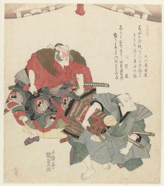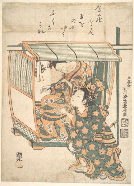 Curator: What a visually captivating scene! I'm drawn to the print’s overall atmosphere, evoking a feeling of intimacy and contemplation. The women almost appear to be in a moment of quiet focus. Editor: Interesting observation. We are looking at "Bamboescherm schelp" a woodblock print created around 1821 by Katsushika Hokusai. My initial thought is about the materials and process here: the woodblock printing process itself, and the use of bamboo for this instrument… what was Hokusai interested in communicating? Curator: Well, Hokusai situates these women, presumably geishas, within the refined world of Edo-period Japan. Their elaborate garments and poised stances suggest a cultivated existence. It seems clear to me that it’s not merely about the object, but more a portrait of class and cultural performance. Editor: I agree, though let’s examine further: the labour needed to create the instrument, to harvest and cure the bamboo and craft the lacquered frame – and not forgetting the process of creating a coloured woodblock. Are we supposed to acknowledge this industry in a work that foregrounds leisured women? And, in light of that, consider what is elided in these portrayals? Curator: Those questions about social labor certainly add another layer. One could explore it in relation to feminist theory that reveals a dynamic tension between visible luxury and unseen labor. It speaks to the systemic exploitation inherent in such displays of affluence. Editor: Exactly. Considering Hokusai's choice to render the musical instrument itself suggests an interest in exploring the means through which art is produced. The very act of making the image itself. Curator: Hokusai encourages us to deconstruct what luxury actually means, what its cultural costs are, and to look at those unseen infrastructures that contribute to what’s put on display. Thank you, it certainly encourages new dialogues for me to continue thinking about. Editor: And by acknowledging both the labor and cultural significance, we appreciate not just the surface aesthetics, but the full story behind “Bamboescherm schelp."