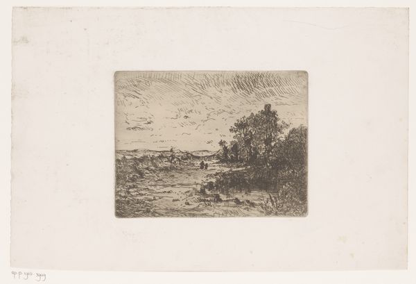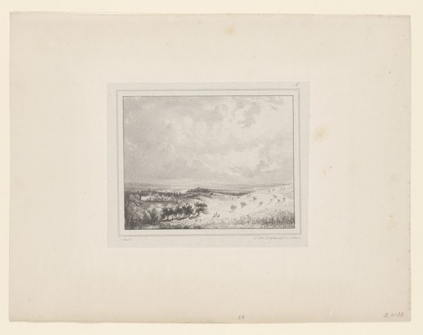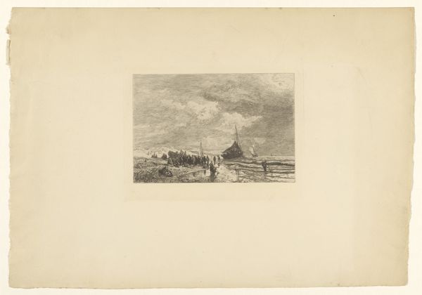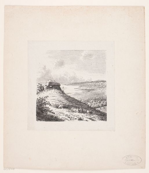 Pierre Louis Dubourcq's "Gezicht op de kust van Texel" captures a serene coastal view with delicate lines and subtle gradations of tone. The composition, primarily horizontal, emphasizes the vastness of the Texel coast, inviting contemplation. Dubourcq's technique, characterized by fine cross-hatching and stippling, creates a sense of depth and texture. The eye is led from the detailed foreground—marked by tufts of grass—across the smooth, reflective beach to the distant horizon, punctuated by soft, billowing clouds. The lone figure on the beach serves as a focal point, establishing scale and invoking a sense of solitude. This print engages with the Romantic era's fascination with nature, yet its formal restraint distinguishes it. The structural clarity and meticulous detail suggest a concern with capturing the essence of the landscape through careful observation and rendering. Ultimately, the artwork functions as a contemplative space, inviting viewers to reflect on their relationship with the natural world. The visual language of line, texture, and composition work together to articulate a particular experience, prompting an ongoing dialogue between the viewer and the viewed.