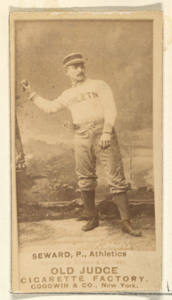 Curator: Let's consider this fascinating piece: "Seward, Pitcher, Philadelphia Athletics," from the Old Judge series, crafted between 1887 and 1890. It's an albumen print by Goodwin & Company, originally part of a series of baseball cards included with Old Judge Cigarettes. Editor: My first impression is one of quiet dignity. The sepia tones give it an antique charm, but the subject’s posture, that controlled poise, hints at something more—a very careful construction of masculinity. Curator: Precisely. It's worth examining the institutional forces at play here. Cigarette companies were rapidly expanding and sought ways to connect with their target audience: primarily white, working-class men. Baseball cards provided that crucial link, fostering brand loyalty and idealizing athletic prowess. Editor: And what about Seward himself? He's not merely an athlete; he’s being presented as a symbol. His slightly elevated position on that platform with the landscape backdrop…it reads almost allegorically, doesn't it? Curator: It does. Seward's image reinforces prevailing ideals about the American sporting hero, notions tied directly to gender, race, and national identity at the time. We must also question who has access to that heroic narrative then, and now. Editor: The backdrop feels almost carelessly painted, further emphasizing Seward as the subject. It speaks to the commercial, almost assembly-line approach to these images, doesn't it? But Seward still transcends that; the way he’s holding the ball shows careful composition and elevates him from a commercial trinket. Curator: These cards weren't seen as "art" initially. Yet they provide a unique lens through which to examine late 19th-century consumer culture, sport's burgeoning influence, and the mechanics of image-making. They constructed desire and reinforced very specific cultural scripts. Editor: Thinking about the fleeting nature of ephemera and how advertising interweaves itself into our own identities today is really fascinating to me. It makes one question the current dominant narratives. Curator: Exactly! That’s what makes exploring art historical, political, and social contexts enriching in today's era. Editor: Absolutely! Thanks for walking me through that one.