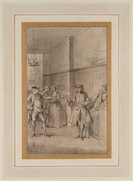 Curator: This is Ludwig Rullmann's "The Premeditation," made sometime before his death in 1822. It feels like a fleeting, clandestine moment captured. Editor: Indeed. My first impression is one of tension and impending confrontation. The stark monochrome and the figures positioned like chess pieces create a palpable sense of unease. Curator: I am curious about the social conventions alluded to here. The gripping of hands, in conjunction with the sword, speaks to very specific codes of honor and masculine interaction. Editor: Absolutely. These men, fashionably dressed as they are, are enacting a very public drama with potentially deadly consequences. The woman, perhaps unknowingly, wanders by. It suggests a societal blindness to violence brewing in plain sight. Curator: The composition itself is quite telling. The two men are locked in a kind of visual struggle, with their gestures and gazes creating a potent symbolic weight. Editor: Rullmann presents an era defined by rigid social expectations and the ever-present potential for transgression. Curator: It seems like an almost theatrical snapshot of its time, a dark commentary on societal rituals. Editor: The image certainly invites us to consider the political implications embedded within what might appear to be a simple street scene.