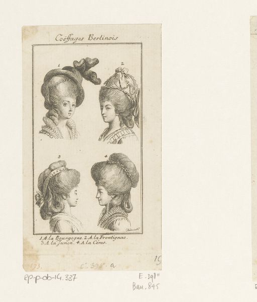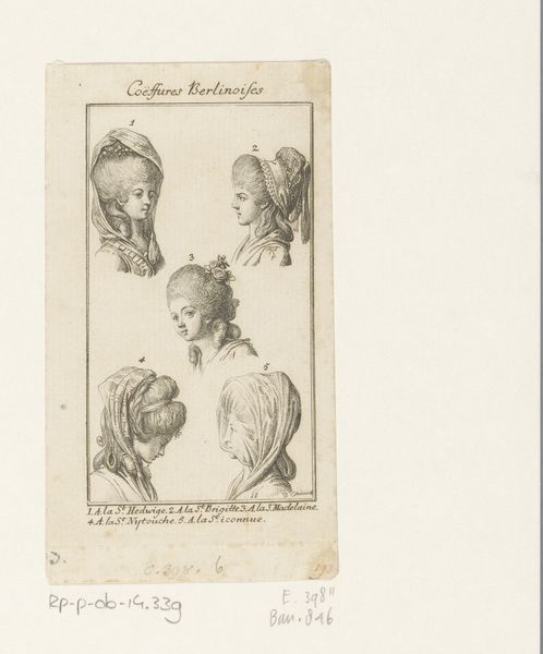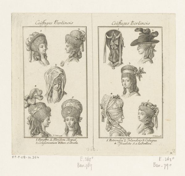 Curator: At first glance, I see these impossible architectural forms perched on women's heads – a bewildering array of powdered wigs and elaborate headwear. There's almost something cartoonish about them. Editor: Indeed! What you're seeing is an etching by Daniel Nikolaus Chodowiecki, made around 1779, titled “Dameskapsels en hoofddeksels.” It resides here at the Rijksmuseum and translates roughly to "Ladies' hairstyles and headdresses." It’s a print showcasing various fashionable hairstyles of the late 18th century. Think of it as a catalogue of sorts. Curator: A catalogue of excess! Beyond the artistry of the etching itself, it's impossible not to think about the socio-economic implications. What did these hairstyles represent in terms of status, power, and even oppression for the women who wore them? Were they a celebration of femininity or a constraint upon it? Editor: Precisely! That’s what’s so compelling. The hairstyles weren’t just aesthetic choices. They were deeply embedded in the social and political landscape of the time. Think of the French Revolution brewing – the sheer extravagance of these hairstyles in contrast to the poverty of the masses certainly fueled revolutionary sentiments. The taller the hair, the closer to the guillotine, perhaps. Curator: Right. The height of these wigs is astonishing, and the time and resources required to create and maintain them surely meant that only a select segment of the population had access to this visual language. How subversive would it have been to shave your head entirely during that time, refusing to partake? It is hard to envision, in that context, how it would have shattered prevailing notions of femininity and power. Editor: That brings up fascinating questions. The performance of gender, as demonstrated through fashion, was so heavily regulated. Any deviation from the norm would have had serious social repercussions. What's remarkable is that Chodowiecki, through this seemingly simple print, captured this elaborate dance between fashion, power, and identity so poignantly. Curator: Agreed, it feels like such a loaded visual record! Thinking about those restrictive structures that shaped women's lives centuries ago enables me to view how certain contemporary forms of self-expression echo, rebel, or renegotiate this historical narrative. It also calls for us to recognize that beauty and empowerment do not come in only one specific guise. Editor: Exactly. Studying objects like this one illuminates how perceptions and constraints transform through time. It is more than simply pretty pictures, and I am so glad it has pushed us towards further, wider and relevant discussions!