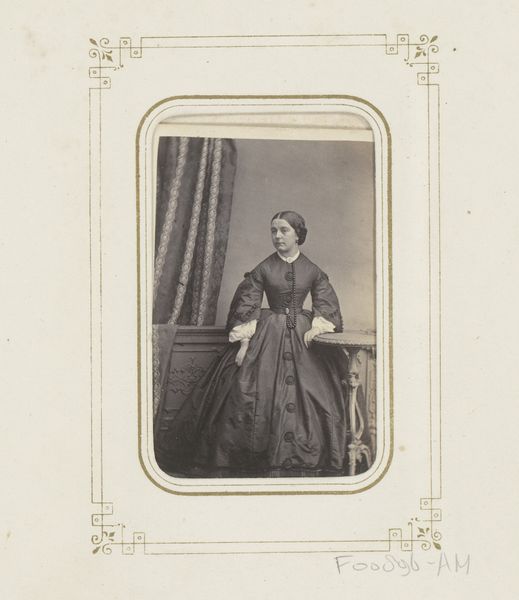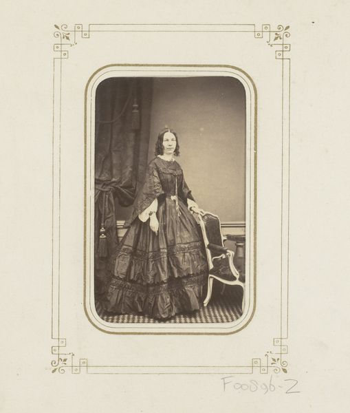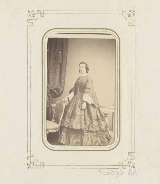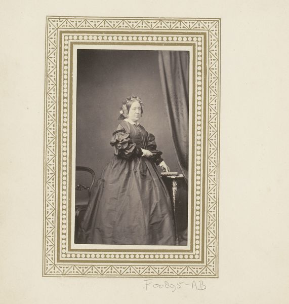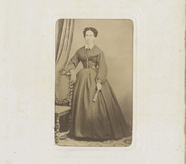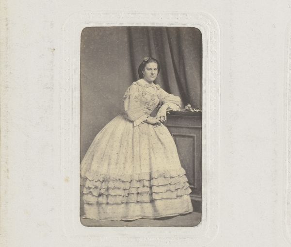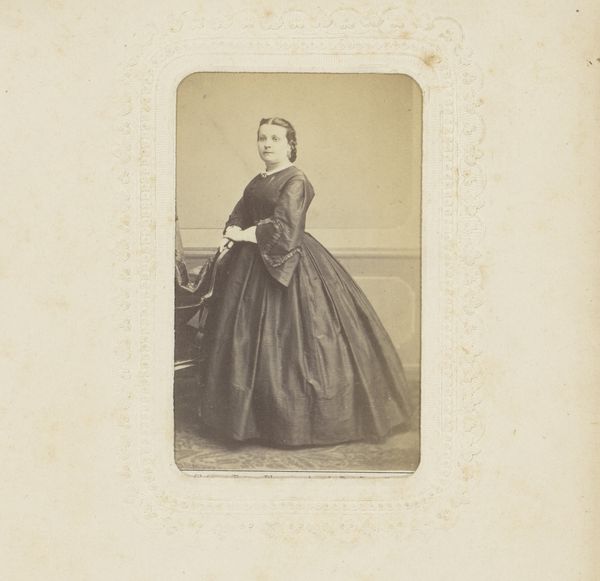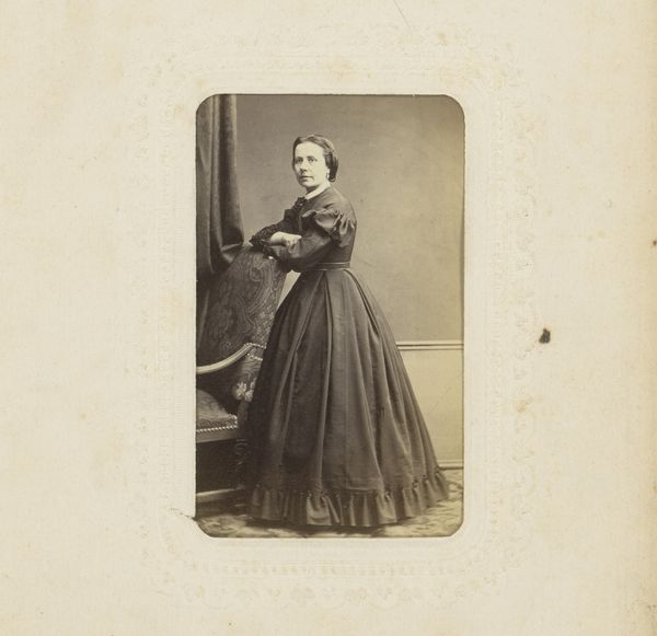 Editor: So, this gelatin-silver print, "Portret van een vrouw bij een spiegel," made between 1865 and 1871 by Maull & Polyblank... there's a certain solemnity to it, a quiet elegance. How do you interpret this work in the context of its time? Curator: The seriousness you observe likely stems from the conventions of 19th-century portraiture. Photography was becoming increasingly accessible, but it still carried a weight, a sense of capturing posterity. The subject's dress, that elaborate full skirt and restrained bodice, signals her social standing. It speaks volumes about the role of women in Victorian society – their lives often defined by strict codes of conduct and presentation. Editor: That's a good point about the conventions. Did the rise of photography influence painting or other art forms at the time? Curator: Absolutely. The democratization of image-making pushed painters to explore new artistic territories. Think about the Impressionists who emerged in the late 19th century. They focused on capturing fleeting moments and subjective experiences, things photography couldn't easily replicate then. The photograph created new avenues of art as it eliminated others. The mirror and how it related to the status of women as the 'decoration' to be mirrored becomes prevalent, and the photograph captured a truth more intimate. Editor: I hadn’t considered how photographic advancements spurred artistic movements. It’s fascinating how socio-political and technological forces shape art. Curator: Exactly! And remember, photographs aren’t neutral records. Consider the studio setting, the photographer’s choices about lighting and pose – these are all carefully constructed to project a certain image, both literally and figuratively, of the subject and the era. Editor: Thank you, that sheds new light on historical portraiture for me. I'll definitely think about the socio-political context of images more deeply from now on.
