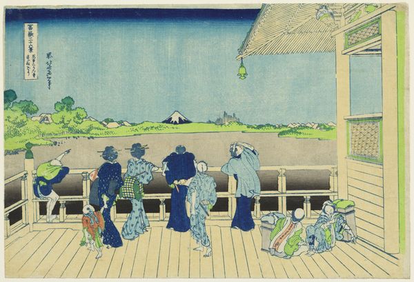 This color woodblock print, "Sazai Hall of the Temple of the Five Hundred Arhats," was created around 1830 by Hokumyō. It depicts a group of people standing on a porch, looking out at a lake and Mount Fuji. This image offers insight into the cultural landscape of 19th-century Japan. Temples like the one depicted here were not only religious sites but also places of social gathering and leisure. We see people from various social strata coming together to enjoy the view. The inclusion of Mount Fuji is also significant. It was a symbol of national identity, frequently featured in art, literature, and popular culture. The print reflects the rise of a commercial culture and the growing popularity of travel and leisure activities among the urban population. To truly understand this print, we need to consider the social and institutional contexts in which it was produced and consumed. Art historical research can illuminate the complex interplay of religion, nationalism, and popular culture in 19th-century Japan.