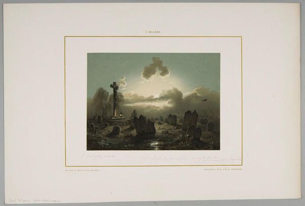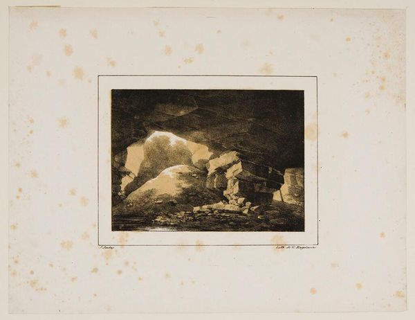 Curator: Here we have "Gypsies," a print by Arnz & Co. currently residing in the Harvard Art Museums. Immediately, the warm tones against the cool rock formations create a striking contrast. Editor: The way the light catches the large stone overhang, juxtaposed with the darkness inside the camp, creates a palpable sense of shelter and community. Curator: Yes, the composition is quite effective. Notice how the figures are arranged in a circular fashion, reinforcing that feeling of togetherness. Editor: And the inclusion of animals, like the lounging dog, domesticates a scene of nomadic existence. How interesting. Curator: I agree. The print really captures the complex interplay between nature and social structures. Editor: It gives you a sense of the everyday, despite the romanticism often associated with such scenes. Curator: Indeed, a fascinating glimpse into the social constructs represented through form and light. Editor: A small window into a way of life, framed with visual artistry.