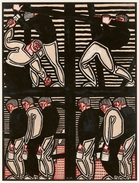 Fernand Léger made "Manufacturers on a blue background" without a known date, using oil on canvas. The clean, unmodulated color areas, and hard-edged forms, give the sense of something machine-made. But look closely, and you’ll see that Léger’s hand is visible in the slightly uneven edges. I love how the figures blend in, yet stand out at the same time. They are a crucial part of the design, echoing the mechanical elements with their rounded forms and simplified features. See how the rope in the center is meticulously rendered, each link a testament to Léger’s process, a detailed focus amidst the broader industrial scene? This feels like a nod to Léger's fascination with modern life and the beauty he found in industry. It reminds me of those early American Precisionists like Charles Sheeler, celebrating the beauty of factories. Ultimately, it’s a painting about balance, a fusion of human and machine.