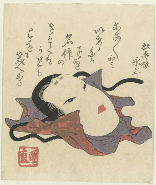 This print, "Woman with Incense Burner," was created by Totoya Hokkei around the early 19th century and is now held at the Rijksmuseum. The woodblock print shows a figure in a seated pose, arranged within a square format that emphasizes symmetry. The artist juxtaposes the softness of the figure against the geometric shapes of the hanging incense burner and the surrounding text. The limited palette enhances the interplay between form and void, directing our focus to the lines that define the figure's garments and the burner's ornate details. Here, Hokkei carefully balances the concrete and the abstract, using both visual and textual elements to construct a composition that invites contemplation. The work exists at the nexus of aesthetic form and cultural narrative, reminding us that art is not merely representational but also an active participant in cultural discourse.