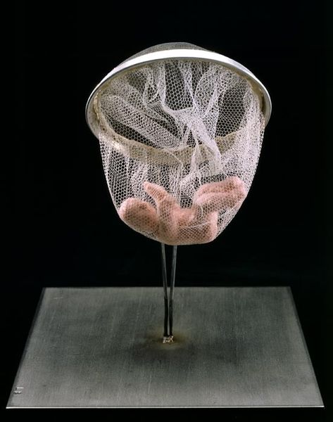 Curator: Here we have John Davies' "William Jeffrey with Device," currently residing in the Tate Collections. The sculpture, approximately 30 by 20 by 40 centimeters, presents a unique juxtaposition of materials. Editor: It's unsettling, isn't it? The netting, like a cage, adorned with pearls. It gives a sense of fragility and constraint simultaneously, a beautiful paradox. Curator: Indeed. The netting and pearls carry layers of symbolic weight. The netting can represent restriction and the pearls—often associated with purity—are juxtaposed with the confinement. Editor: It makes me think of the societal pressures, the expectations we place on ourselves and others. That tension between the desire for freedom and the feeling of being trapped. Curator: Precisely. Davies masterfully utilizes common materials to explore the complexities of identity and the human condition. Editor: Well, it certainly leaves you with a lot to ponder. I am curious to know what is under the net.