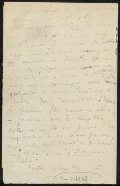 Curator: Here we have “Conceptbrief aan de heer en mevrouw Berg,” which translates to “Concept Letter to Mr. and Mrs. Berg," likely created around 1918 by August Allebé. It’s an ink drawing on paper, a striking example of hand-lettering. Editor: Immediately, I see fragility in it—the delicate script, the slight yellowing of the paper. It feels like a whispered secret across time, so intimate despite being, essentially, just words. Curator: Exactly. It’s essentially a personal sketchbook page, an example of ink drawing experimentation. Notice how Allebé varies the pressure of the pen, creating depth and texture. Each word seems carefully considered, like a miniature work of art in itself. The use of line weight suggests not just legibility but aesthetic pleasure, reflecting broader trends toward typography as art. Editor: And the language itself—old-fashioned and polite—conjures up a particular moment in history. This was a period of immense social upheaval across Europe, making something as small and contained as this letter even more resonant. What would the socio-economic context have been at that moment? Curator: Perhaps the post-war era, a period marked by reflection, mourning, and a search for beauty amidst loss. Given its display in the Rijksmuseum today, it offers viewers insight into Dutch bourgeois society. We see evidence that a personal missive can outlive both artist and original recipients as an object that evokes nostalgia for a quieter age, an antidote to our digital cacophony. Editor: I suppose that seeing all the effort and deliberation, knowing that hands created each curl and flourish… well, it speaks to the enduring human desire to connect. There’s beauty and artistry here that I find very human, honest, and evocative. Curator: I agree. This is where private moments meet history head-on. Editor: Leaving us both slightly more attuned to the art of written connection.