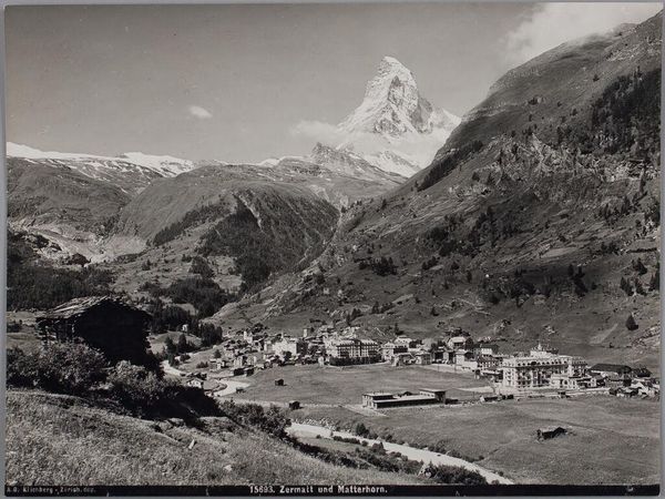 Editor: We're looking at "Gezicht op Zermatt en de Matterhorn," a gelatin silver print, dating from around 1897 to 1900, housed at the Rijksmuseum. It feels timeless; a serene mountain scene that evokes a sense of stillness. What do you make of it? Curator: Timeless is a great word! To me, this image hums with the quiet confidence of nature’s grandeur. That stark contrast between the almost impossibly sharp peak of the Matterhorn and the sleepy, sun-drenched village nestled below – it’s pure theatre, wouldn't you agree? It's like nature's stage, complete with its own spotlight. Editor: Absolutely! It’s like the mountain is this stoic giant watching over the village. I guess the scale is what’s so striking. Do you think that contrast was intentional? Curator: Oh, I think it was a very conscious choice! Photography at this time was rapidly evolving; landscapes allowed photographers to demonstrate control of light, of perspective. Capturing that specific mood, that feeling of smallness in the face of overwhelming nature? That's intentional, even artful, wouldn’t you say? The silver gelatin process would've offered rich tonality, which enhances the atmospheric feel. How does that interplay between the dark foreground and bright mountain make you feel? Editor: It emphasizes the depth, for sure. It's almost like you're invited into the scene, starting in this shadowed area, leading your eye to the luminous peak. It really puts things into perspective. Curator: Precisely. We're reminded of our place in things – insignificant, perhaps, but also intimately connected to the raw beauty of the world. The way the anonymous artist captured the light bouncing off that snow… It’s pure magic. Editor: This makes me appreciate the photograph a bit more. Thank you! Curator: My pleasure. Art's like a conversation; sometimes all it needs is a fresh ear.