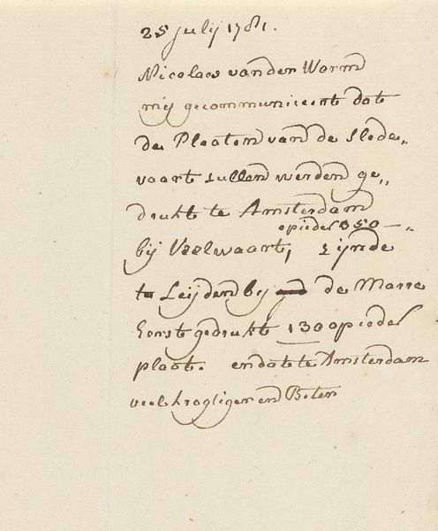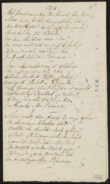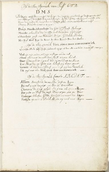 Curator: This drawing, executed in pen and ink on paper, is entitled "Triomflied over de Schilderkunst en de Dood (deel 3)" which translates to "Triumph Song over Painting and Death (part 3)." It was created by Henrik Jordis around 1660 and currently resides in the Rijksmuseum collection. Editor: It feels intimate. The delicate script on the aged paper creates a very quiet, almost secretive mood. The way the ink bleeds slightly suggests the passage of time. It seems almost accidental in its rendering, raw and spontaneous, despite the highly controlled technique. Curator: Indeed, Jordis utilized precise, almost calligraphic, pen strokes to construct the text. Note how the contrasting dark ink against the pale paper establishes a visual hierarchy guiding our eye across the composition. What statements are you able to extract as core textual insights? Editor: It certainly appears to address the conflict between art and mortality. This could mean the societal anxiety surrounding the transient nature of human existence, particularly poignant amidst plague outbreaks or social upheavals, right? Perhaps even touching on the idea of how art can serve as an act of defiance, and memory beyond the inevitable doom we all face. Curator: Precisely. Considering the historical context of 17th-century Netherlands, with its preoccupation with mortality in the face of widespread disease, it becomes all the more understandable. The text laments Death in its entirety, with a plea toward ‘schilderkonst’, calling painting to be remembered. Editor: It’s fascinating how such simple materials—ink and paper—can encapsulate such profound existential themes, a very intimate window into that cultural framework. Curator: I concur, the artwork exemplifies how close visual examination, coupled with knowledge of socio-cultural forces, provides enriching experience and broader awareness in understanding an artwork.