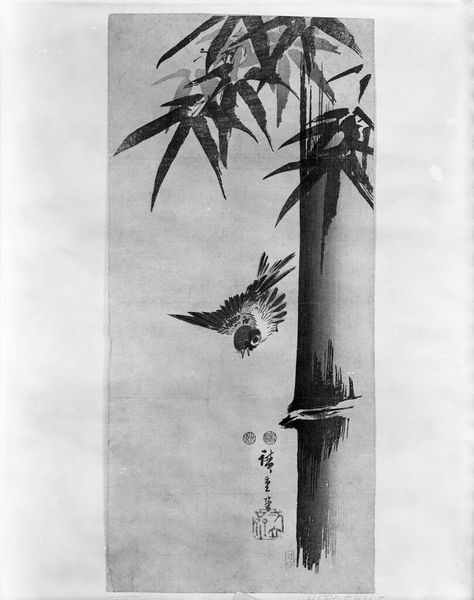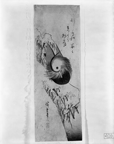 Editor: This is Utagawa Hiroshige's "Mandarin Ducks and Bamboo," created sometime before 1858, and currently at the Harvard Art Museums. The monochromatic palette gives it a sense of calm. What's your take on this piece? Curator: Notice how the woodblock printing process democratized art production in Japan. Consider the labor involved in carving those blocks and the accessibility of the final product. Editor: So, it's less about the individual artistry and more about the system that allowed its creation? Curator: Precisely. The materiality of the print and its means of distribution highlight a different kind of value than, say, a singular oil painting. Editor: I see. It challenges the idea of art as a precious, unique commodity. Curator: Absolutely!
