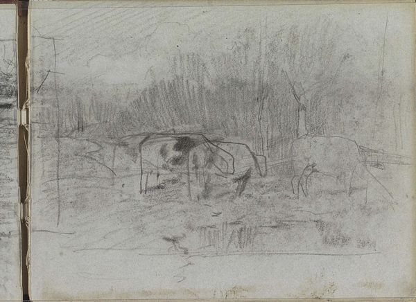 Editor: This is Anton Mauve's "Aardappelrooiers," or "Potato Harvesters," a pencil drawing on paper from around 1886 to 1888. The scene feels so stark and laborious. What can you tell me about it? Curator: It’s compelling, isn't it? Mauve, as a realist painter and cousin-in-law to Van Gogh, gives us a glimpse into the difficult lives of rural workers. Consider the date, the late 1880s; this was a period of increasing industrialization, yet large parts of the population were still heavily dependent on agricultural labor. Editor: It really highlights their reliance on the land. There is also this inherent contrast, no? On one hand the quiet, slow farming world, versus the hurried and busy city centers. Curator: Precisely. Now, observe the figures. They are bent over, immersed in the act of harvesting, almost as one with the land. It is a deliberate choice. Mauve wants us to reflect upon the socio-economic disparities of the time, perhaps prompting a dialogue on labor rights and land ownership. How does that relate to contemporary societal problems? Editor: Wow, I didn't consider that at all. I was caught up in its gloomy aesthetic, but now I see it as a statement about the socio-economic conditions of rural workers and perhaps even land distribution! Curator: Exactly! It invites us to examine not just the beauty of the sketch, but also the social structures it reflects and critiques. Editor: That's given me so much to think about, thank you!
