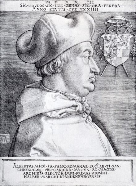 Editor: Here we have Albrecht Dürer's "Portrait of Cardinal Albert of Brandenburg at Age 34," created in 1523. It's a print, so likely an engraving or etching. I am immediately struck by the starkness of the lines, creating such a formal and imposing figure. What do you see in this piece, considered from a formalist perspective? Curator: Initially, I observe the pronounced linearity dominating the composition. Dürer masterfully utilizes line not only to define form, evident in the subject's profile, but also to create tonal variations. Consider the density of hatching and cross-hatching that renders depth and shadow. Notice how the contrasting textures achieved purely through the manipulation of line articulate different materials, such as the fabric of the cardinal's hat versus the smoothness of his face. How does this affect the overall viewing experience, do you think? Editor: I think the focus on line almost flattens the image despite the shading. It feels deliberate, as though Dürer is more concerned with presenting the essential form than creating an illusionistic likeness. Does the inclusion of the text at the top contribute to the work’s form? Curator: Precisely. The inscription is not merely an addendum; it is formally integrated. The letterforms and their arrangement act as another layer of graphic elements, mirroring the meticulous detail present in the cardinal’s portrait. The text creates visual balance with the coat-of-arms on the right, providing both symmetry and textual grounding. What about the use of symmetry within the portrait itself? Editor: I hadn’t noticed, but the hat mirrors the shape of the shoulder cape. I see now it's a play on visual echoes that give the print a sense of compositional balance. It makes me appreciate the image's intentional design. Curator: Yes, by examining elements like line, shape, and form, a renewed depth of understanding comes forward that speaks beyond simple representational image making. Editor: Absolutely, considering those relationships in Durer’s portrait makes it more powerful and carefully constructed than I initially thought.