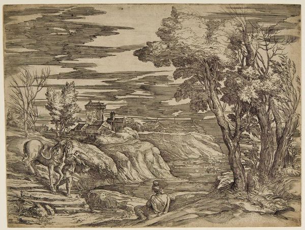 Editor: This is Frans van den Wyngaerde's "Landscape with Two Men in a Boat," an etching. The detail is incredible! It makes me think about the artist's labor to create it. What's your take? Curator: The networks of production are very interesting here. Consider the paper itself, its sourcing and manufacture. The etching process—the tools, the acid, the press—all represent layers of skilled labor and resource extraction. How does this affect your understanding of the "landscape" depicted? Editor: I never thought about that! It shifts the focus from just the scene to the means of creating it. Curator: Exactly. The consumption of art itself involves materiality and labor. Perhaps Wyngaerde is making a statement about our relationship with the land, not just depicting it. Editor: That makes me see the artwork in a different way. Thanks for the insight!