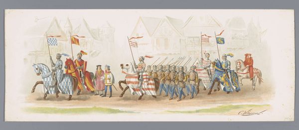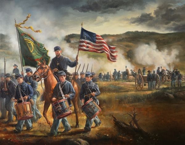 Editor: This oil painting, "The Revolution Victorious" by Mort Künstler, was completed in 1977. It depicts a scene from the American Revolutionary War. It definitely evokes a sense of solemn pride, but how do you read this work? Curator: What immediately strikes me is the visible labor embedded in this image. The material realities of war are carefully displayed, from the worn uniforms to the meticulously rendered cannons. The oil paint itself, layered to create texture and depth, echoes the physical demands of both artistic creation and warfare. Editor: I hadn’t considered the labor involved in the artwork itself, just what’s depicted. It’s interesting to think about that. Curator: Precisely! Consider also the social context. This was painted in 1977, during the American Bicentennial. What narratives surrounding labor, value, and consumption might Kunstler be subtly engaging with in this piece? Does he romanticize the revolution, or is there a hint of critique in this meticulous representation of material conditions? Editor: That makes me think about who the painting was made for. Was it intended for textbooks, maybe? The composition almost feels designed to tell a story, like it's meant to illustrate a historical event. Curator: Yes, and think about the consumption of history itself! How is the revolution commodified and consumed through such imagery? This challenges traditional boundaries of "high art." Where does history end, and propaganda begin? Editor: That's a lot to unpack! I think I’ll definitely be looking at historical paintings differently from now on, especially considering their historical and material contexts. Curator: Exactly. Seeing art as the product of labor and material conditions really opens up exciting avenues of interpretation and a more complex understanding of their role in society.