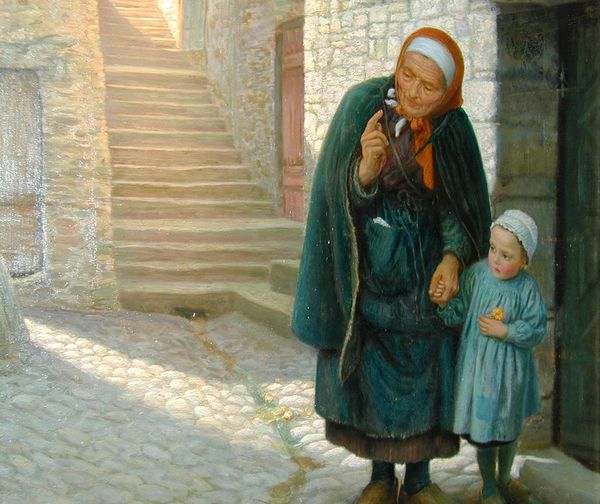 Editor: Konstantin Makovsky’s “Strolling Musicians,” painted in 1900 with oils, depicts two street performers in what seems like a sun-drenched Italian alleyway. I am really drawn to the contrasting expressions - one focused and absorbed in his music, and the other pensive. What’s your take? What draws you in? Curator: Oh, the world hidden within this street corner is enchanting. For me, it’s the textures – the roughness of the stone against the smoothness of the instrument, the stiff newness of the little boy’s clothes compared to the musician’s weathered fabrics. Do you see how Makovsky uses those contrasts not just to depict reality, but almost to hum a little melody of his own? Editor: That’s beautifully put. I see the contrasts, yes, but I hadn't thought of them as creating a kind of visual song alongside the musical one. Curator: Indeed! And it's a song about resilience and joy snatched from everyday life, a theme so popular then – the everyday elevated to art. It makes me wonder about their story… Who are they? Father and son perhaps? I picture the young one staring, pondering their transient life with bagpipes echoing in the old alleyway... Maybe even writing his own song. What will the future bring? Editor: That's such a richer way to look at this than I did initially, and how nice it is to envision what lies behind their expressions! I will try that on my own with new works. Curator: Perfect. Let your intuition soar! And as we imagine that tune fading down the cobblestones, it makes us realize this isn’t just a pretty picture – it’s a question about life and music in this world. Food for the artistic soul, and a pretty vibrant painting to enjoy the exploration.
