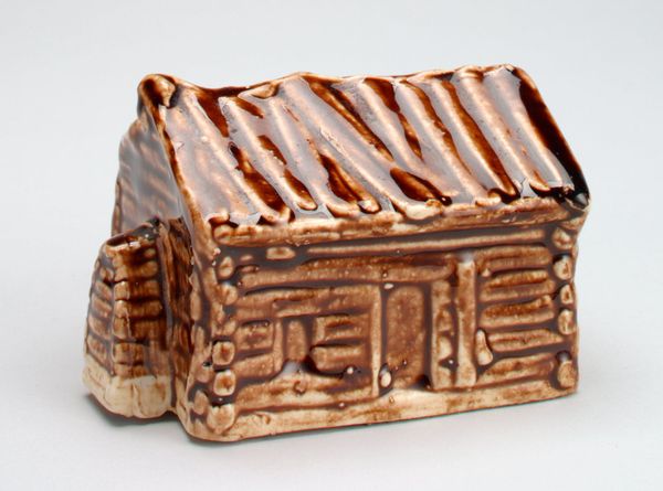 Curator: The earthy tones are immediately appealing. It exudes a rustic charm, almost…primitive in its rendering. Editor: Indeed. Here we have what’s titled '-Log Cabin- still bank' originating from the 19th century, made by an anonymous artist using ceramic earthenware. It resides here at the Minneapolis Institute of Art. Curator: Still bank – a fascinating utilitarian object rendered in clay! Its form closely mimics the structure of an actual log cabin with attention dedicated to horizontal lines. Editor: Absolutely, and beyond being merely representational, consider its placement within 19th-century American culture. These still banks were tools encouraging thriftiness during industrialization and the shift towards a wage-earning economy. These objects instilled the virtues of saving even in children. Curator: An excellent point, this object speaks volumes of not just craftsmanship but a particular moment and ideology. If we examine the dark brown glazing—what formal qualities emerge? The uneven, dappled appearance evokes natural textures... the bark on trees... the unpredictable beauty of the wilderness itself. This echoes ideas tied to expansion, frontier life, and the American ideal of manifest destiny. Editor: The 'Log Cabin' bank operated not just on personal ideals but through promoting a national narrative steeped in values, a nation's dream materially captured and promoted for each individual through savings. The history of capitalism intertwined with sentimental representations! Curator: Exactly. And thinking beyond just cultural ideology, it stands as an intriguing ceramic piece in its own right. It's clear how the artist consciously simplified and amplified elements, creating both functional use and aesthetic significance. Editor: Considering the narrative, materiality, it showcases the intimate tie of ordinary objects to greater currents of life – finance, hope, nationhood. Curator: A potent convergence of technique and culture contained within a modest vessel, inviting introspection.
