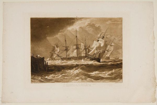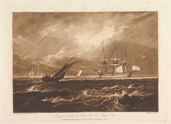 Joseph Mallord William Turner created this print, "Ships in a Breeze," using etching and mezzotint. These are both laborious printmaking processes, involving the careful manipulation of a metal plate. The image is made by first etching lines into the metal with acid, and then further shading the image by roughening areas of the plate, creating a burr which holds ink. It’s a slow process of building up tone and texture. Look at the way Turner captures the turbulent sea, the swells and troughs rendered through this careful modulation. You can almost feel the spray. Turner was deeply engaged with industrial modernity, and printmaking allowed him to disseminate his vision widely. The *Liber Studiorum* was conceived as a compendium of his work, making it accessible to a broad audience. Yet, the human touch is still evident in every line and shadow. Considering the amount of labor involved in the printmaking process gives us a new appreciation for the artistry involved, and bridges the gap between the industrial and the handcrafted.