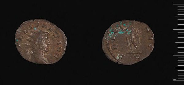 Curator: This is an Antoninianus, a coin issued during the reign of the Roman Emperor Gallienus. I’m struck by how this small object connects us to the political and economic realities of the Roman Empire. Editor: It certainly feels weighty. The wear and tear suggest it's been passed through countless hands. I notice a figure on one side—a draped woman? What does she represent? Curator: That's likely a depiction of a Roman deity. Coins were powerful propaganda tools, used to disseminate imperial imagery and reinforce ideas about power and divine right. Editor: So, even these tiny objects participated in shaping public perception and maintaining political order. It makes you wonder about the messages we carry in our own pockets today. Curator: Absolutely. And the symbols and figures chosen reveal much about the values and priorities of the ruling elite, and the empire's efforts to maintain its cultural narrative. Editor: It's amazing to think that such a small, unassuming artifact can tell us so much about the grand sweep of history.