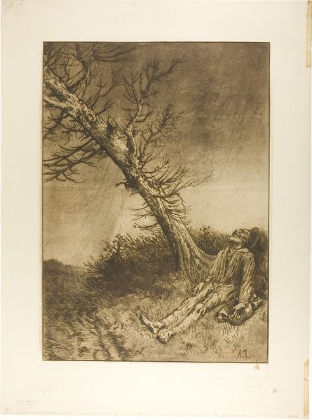 Curator: Look at this wonderful print by Pieter Dupont, dating back to 1896. It’s called "Wilg" which I believe translates to "Willow" – crafted with etching and wood. Editor: Well, right away, I see a presence. A stoic energy that feels both ancient and fragile, somehow trapped on this small rectangle. Curator: Trapped, that’s interesting. What makes you say that? Considering the vastness trees represent in landscape art, what impression do you have of the frame, or format of this tree? Editor: There’s such density, you know? It feels as though this tree’s entire essence, its entire life story, has been distilled into this small scene. The textures of the bark—they're practically shouting with history, but confined within those hard edges, almost as if it’s a prisoner in plain sight. The marks and scratches give this tree a worn-out soul as if someone beat it with the weight of time. Curator: I love that observation! This was done with a very sensitive, descriptive kind of style, which in the late 19th century focused on realism and very accurate depictions, but still maintained its expressiveness through mark making. Knowing that these marks and scratches would create texture gives this landscape some character and brings forth this life force and energy that we both agree on. I'm glad we see the same thing. Editor: And perhaps what draws me to this kind of artwork is exactly that duality: a life force compressed by imposed borders. In many ways, this represents communities, like people forced to leave their homeland or to exist in predefined categories and conditions that are set forth by others, especially at the turn of the 20th century when national and social constraints were abundant. Curator: Exactly. Art does often hold those contradictions, doesn't it? A single tree containing a multitude of stories; limited in format, yet expansive in interpretation. Editor: Makes you think, doesn’t it?