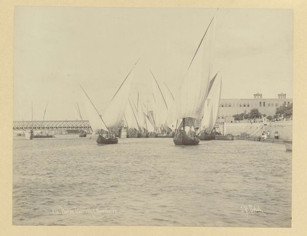 Curator: This gelatin-silver print by Paul Güssfeldt, titled “The ship de Hohenzollern surrounded by full rowboats in a harbor,” captures a vibrant scene from 1889. It really evokes a strong sense of place, doesn’t it? Editor: Absolutely, but it also feels a bit melancholic. The sepia tone lends an air of faded grandeur, almost like a memory. And look at all those rowboats—packed with people yet they seem so quiet, reserved even. Curator: Perhaps the solemnity stems from what the ship, the Hohenzollern, would have represented: power, progress, perhaps even empire. Rowing towards such a vessel may have had symbolic significance for these citizens. The horizon, punctuated by that church spire, seems to balance temporal and spiritual authority, doesn’t it? Editor: True, but let’s not overlook the labor involved in creating this image. Consider the collodion process used at the time, the careful development needed to achieve this tonality on the gelatin-silver print. It is not only the event it pictures but also the photographic technique itself. Curator: Precisely. This choice of medium amplifies a tangible sense of history. Consider how, beyond simply documenting the day, Güssfeldt made active choices about composition that enhance deeper thematic concepts. It speaks volumes about this era's cultural memory. Editor: And about social structure. There's something quite telling in the mass production implied by all those nearly identical rowboats, all made in a shipyard or factory according to certain specifications of the day, but rowed with such human force, even skill. One questions what the meaning of each single one is! Curator: You've got me thinking… beyond the visible activity and historical event being pictured, the photograph creates the silent story of this society as a cohesive group working with similar purposes for all involved people to coexist in that era of Germany! The iconographical message it passes is astonishing. Editor: It’s about how our view shifts once we look at who labored. Knowing this image wasn't simply a snapshot changes the feeling drastically! It shifts it to a labor production site, it is a window to those who have never sailed! Curator: Yes, understanding the image through your materialist lens and mine, we see it is less a static snapshot, and more a meditation on labor, technology and national identity at a specific turning point in time. Editor: A point that shows the value of seeing through production and context to appreciate.