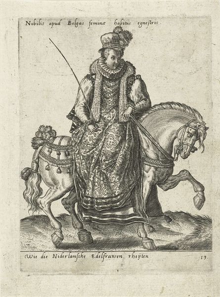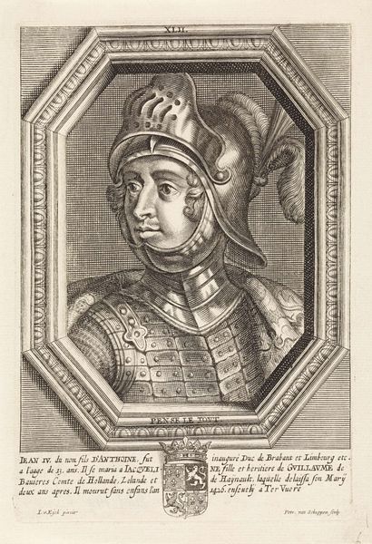 Curator: Here we have an engraving titled "Portret van Abbas I, sjah van Perzië," or "Portrait of Abbas I, Shah of Persia," dating back to the 17th century. Look at the incredible detail captured here. Editor: My first impression is the weight of representation. The figure seems almost… boxed in by symbols of power. All those tiny soldiers and horses! It feels like looking at a stage set more than a person. Curator: It's fascinating how these historical portraits functioned, isn't it? Think about the purpose: this wasn't just about likeness. The image presents an ideal—Shah Abbas I, ruler, commander, embodiment of Persia. It makes me wonder what the context surrounding Islamic art had to do with figuration as representation in a specific context and era. Editor: Right, it's pure messaging, playing on archetypes of rulership across cultures. Fur-lined cloak, elaborate turban, the little scepter topped with what looks like a decorative grenade. Each element signifies status, yes, but also participation in a certain performance of power, not all that dissimilar to what royals did elsewhere. Curator: Indeed. That fur-lined cloak! Imagine the wearer in life. Consider that backdrop. Look closely! It is a procession with spear carriers on foot and on horseback. Now notice, set behind him, a coat of arms or family crest of sorts. It shows how carefully this image was assembled to project strength and lineage. It speaks volumes about empire-building as both cultural and economic endeavor. The very posture, and expression are measured and formal. The upturned open hand shows not only rank and rule but power over a great people. It almost dares one to touch it! Editor: And let's think about the role of visual art in a period, particularly for Islamic rulers whose representations faced particular controversies. Consider questions like: Did images promote recognition and solidify their control over populations both literate and illiterate? The circulation of this engraving undoubtedly shaped perceptions across vast territories, making Abbas into an icon before "image" took its modern meaning. It begs the question of control and reach over peoples who were, themselves, artists who might create radically different narratives if they could. Curator: It all blends in, and you know, seeing art, and art history is one thing, understanding a moment and how to connect its meaning with the contemporary moment is yet something else. Art isn't some stuffy thing, from a specific era that you learn about or see or consider for the sake of it. In it, are all kinds of lessons, clues to what to look out for, to not take for granted. I find that the greatest beauty of these older works, such as this, and what makes studying and appreciating them is that so much, if not all, can still be relevant, now! Editor: Yes, these glimpses into the past are never truly gone as history reverberates and echoes across centuries to our current condition. We're left to ponder these complexities and learn as much as possible as humans who appreciate and benefit from it!