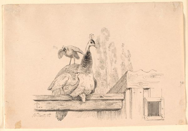Adolph Kittendorff created this artwork, 'God nat!', using pen and ink. The composition is neatly divided into two planes of attention. To the left, a structured gate, sharply defined. In contrast, the right is dominated by softly rendered peacocks, resting as a family. A semiotic reading might suggest the gate represents the barrier of domestic space, while the peacock family represents the wild, organic world. The lines, though simple, reveal a sophisticated understanding of form. Note how Kittendorff uses hatching and cross-hatching to create depth and volume, particularly in the plumage of the birds. The stark contrast between the rigid linearity of the gate and the flowing lines of the peacocks also invites us to reflect on how we categorize and compartmentalize nature and culture. The artwork challenges fixed perspectives on nature. Instead, we are invited to engage with a more nuanced understanding of these categories.