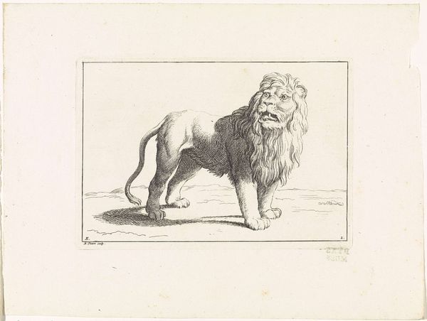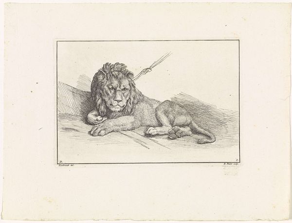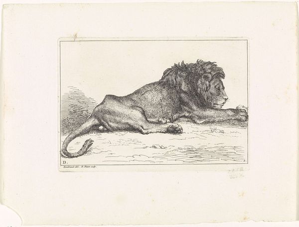 Bernard Picart created this print, Liggende leeuw, which translates to Reclining Lion, sometime between 1683 and 1733. During this period in Europe, the Western gaze toward the animal kingdom was evolving, influenced by colonial encounters and the burgeoning scientific revolution. What does it mean to portray a lion in repose, seemingly devoid of the regal power typically ascribed to it? Perhaps Picart, working within a society deeply structured by hierarchies, subtly critiques those very systems of power. The lion, a symbol of strength and dominance, is presented here in a moment of rest, almost vulnerability. Consider the emotional resonance of this image. Does the lion's posture evoke a sense of empathy, challenging the traditional narrative of the animal as a symbol of untamed power? This representation invites us to reconsider the power dynamics that permeate both the natural world and human society.
