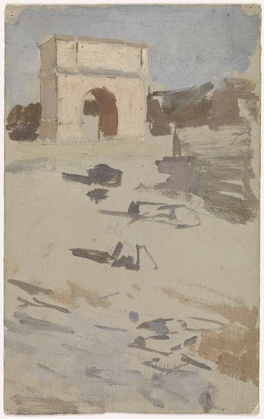 Curator: Immediately, the hazy atmosphere and the figures in the boat evoke a sense of leisure and tranquility. Editor: This is "A Punt" by William James Müller, a watercolor piece in the Tate collection. It invites us to consider the materials used, specifically the way Müller handles the watercolor. Curator: The boat, the trees... they all seem to blend, almost like a dream. Is there a deeper symbolism? Perhaps a reflection on life's journey? Editor: Or perhaps it's Müller's focus on capturing the effects of light on water. The materiality of the pigment interacts with the paper, and that's key to conveying atmosphere. Notice how the fluidity of the watercolor contrasts with the solid forms of the buildings. Curator: True, the buildings are more grounded, providing a sense of stability amidst the fluidity. It's a nice visual contrast. Editor: It makes me think about Müller's process, how he built up layers of color to create depth and texture. The social context is also interesting; leisure activities like punting were becoming increasingly popular among the middle class. Curator: Ultimately, it's a glimpse into a peaceful moment, rendered with a beautiful, ethereal quality. Editor: And a testament to the power of watercolor to capture the ephemeral beauty of the natural world.