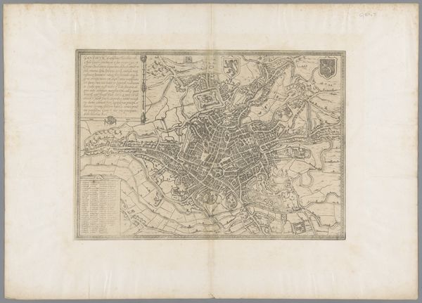 Curator: This is J. Zipter’s "Plattegrond van Wenen met zes details van gebouwen," or "Map of Vienna with six details of buildings," created in 1833 using etching. The sheer density of information is impressive! What are your first thoughts? Editor: It's fascinating! I’m struck by the level of detail. The artist really shows the city in its full capacity! What interests you about it? Curator: Immediately, my thoughts go to the materials themselves, and how this object circulated. The print, made by etching, implies a certain level of mass production, yes? Consider the social and economic forces at play. Who commissioned it? Who was the intended audience? Were they wealthy people needing orientation, or entrepreneurs considering investments? Editor: That’s a good point! The detailed key suggests practical use, not just aesthetic appreciation. The question is, what about the labor of production? Curator: Precisely! Think of the labor involved in creating this detailed plate, the etcher’s skill, the printer’s work, the distribution networks. The print becomes a commodity, reflecting Vienna's burgeoning capitalist landscape in the 19th century. Each tiny line representing the city's streets and buildings required someone’s time and effort, which in turn served a function within an established social hierarchy. Editor: So you are saying it is not just a pretty map, but a window into 1833 Vienna’s economy. Are there particular architectural structures within the images, as a reflection of this material aspect? Curator: Consider also the chosen buildings in the details around the central map: administrative, cultural, religious...They represented social authority, reflecting the social values imposed by that environment. A materialist perspective invites us to dig beneath the surface to consider production, consumption, and how they reinforced specific power dynamics in Vienna. Editor: I never thought about a map having a social message like that before, thinking about what and how it was produced, circulated, and consumed. Curator: Precisely! It reveals more about society’s intricate network, not just locations, than what is initially observed.