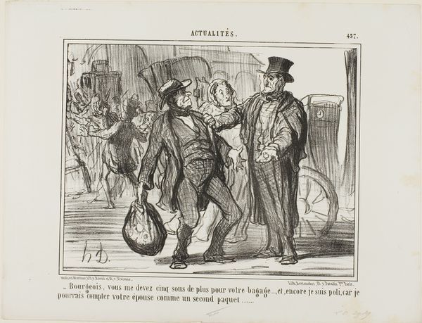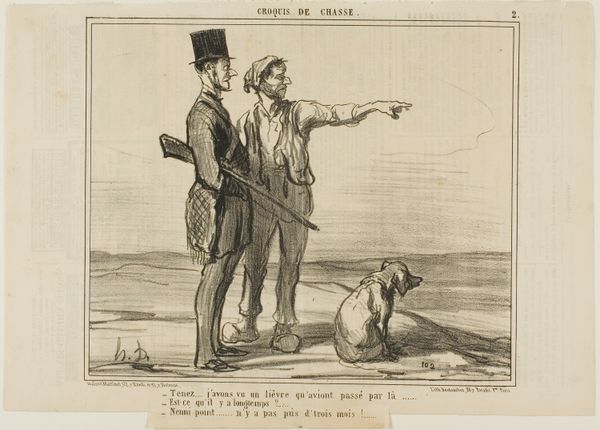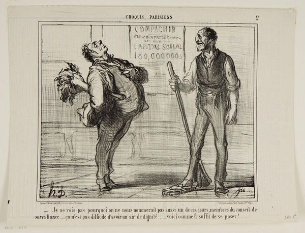 Editor: We're looking at “- I really don't see why we shouldn't be nominated members of the surveillance council one of these days..... after all it isn't that difficult to look dignified... how about a pose like this?," plate 2 from *Croquis Parisiens*, a lithograph by Honoré Daumier, created in 1856. The lines are so expressive, almost caricatured, and I’m curious to know more about the artist’s choice of form. How do you interpret Daumier's use of line and form in this piece? Curator: Notice how Daumier employs line not merely to define the figures, but to create a sense of volume and texture. The hatching and cross-hatching build depth, particularly in the garments. Ask yourself, what effect does this focused rendering of fabric have on the overall composition? Does it distract or complement? Editor: It definitely gives them weight, and contrasts sharply with the sketchy background. Curator: Precisely. The strategic deployment of light and shadow – observe the concentration of dark lines in the folds of the clothing versus the relatively blank space behind – sculpts the figures, lending them a tangible presence. It emphasizes the materiality of the clothing itself, almost elevating the everyday. Editor: So the *how* of the depiction becomes as important as the *what*? The clothing suggests social commentary itself. Curator: Indeed. Consider, too, the use of perspective and proportion. Are the figures depicted naturalistically? Is there an exaggeration or distortion that influences your interpretation of their interaction and purported social standing? Editor: I see what you mean, there’s an element of exaggeration. Reflecting on your point regarding line and shadow, I appreciate now how integral they are to building the characters and telling a silent story. Curator: It's in that delicate balance of form and intention, rendered with exceptional command of technique, where the piece reveals its sophistication.