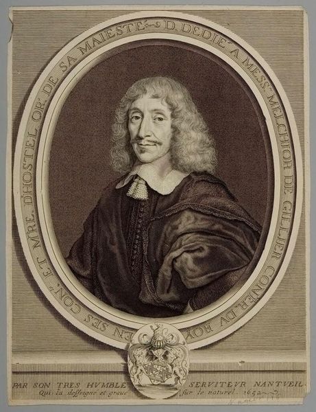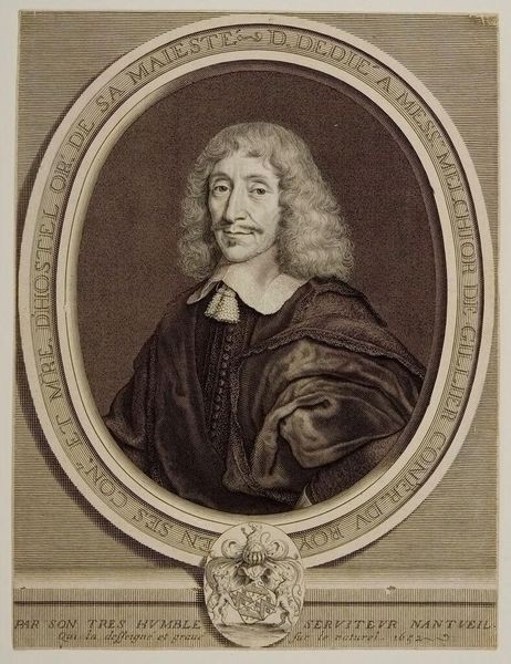 Editor: Here we have Robert Nanteuil's portrait of Maréchal Charles de la Porte. The engraved lines making up the textures of his armor are quite striking. What production processes and materials stand out to you in this piece? Curator: The labor involved in creating such detailed engravings is considerable. Note how Nanteuil uses varying line weights and densities. Consider, too, the social context of portraiture at the time—who commissioned these works and what purpose did they serve in constructing identity and power? Editor: So, it's less about the man, and more about the process and the society he lived in. Curator: Precisely. Think about the consumption of these images, how they circulated, and how they contributed to the market of luxury goods and status symbols. Editor: That shifts my perspective entirely. Thanks! Curator: Indeed, materiality offers a unique lens.