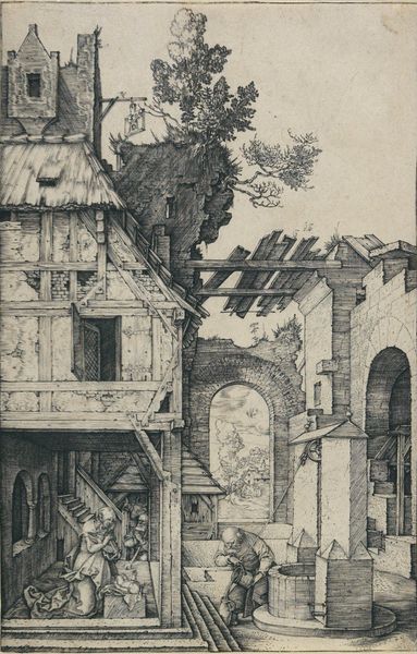 Curator: At first glance, this print feels like looking into a secret world. The textures pull you in instantly; the sharp, intentional marks build this incredibly rich and complex scene. Editor: "De Geboorte van Christus," or "The Birth of Christ," created sometime between 1504 and 1566 by Wierix, which now calls the Rijksmuseum home. It is not what you would expect a Nativity to be, is it? Curator: Definitely not! I feel this almost uncanny mix of construction and ruin. There's so much architecture, a collapsing yet hopeful state of decay with that persistent tree growing out of a damaged wall. I’m pulled into its imperfection and fragility. Editor: It speaks to the instability and political turmoil of the era, particularly the Dutch Revolt against Spanish rule, perhaps. The image of birth and renewal set against a backdrop of ruin mirrors the anxieties and hopes of a society in transition. Think about the public who originally viewed it—it presented them the birth of Christ not as a static symbol of faith, but as an event deeply connected to the uncertainties of their everyday lives. Curator: Exactly. The birth of hope emerging from chaos. I mean, we can see the Nativity scene itself tucked almost out of view on the bottom left— overshadowed almost by the surrounding world— but it grounds it, that kernel of light amid decay. It is incredibly striking. Editor: I find that positioning significant. Wierix wasn't simply illustrating the Bible. He was crafting a political statement using the symbolism of religious imagery—almost subversive at the time. The placement challenges us to consider the real-world implications of the Nativity story, connecting spiritual renewal with the potential for societal change. Curator: Absolutely. Wierix took the old story and grounded it in very human, political concerns. I find that incredibly powerful. This little, unassuming print holds within it such great depths of commentary. Editor: Yes, and seeing how an event like that interacts with society then and still now, helps me better conceptualize what these things mean, and how history informs life, how political action shapes art and what these things tell me as an audience, now.