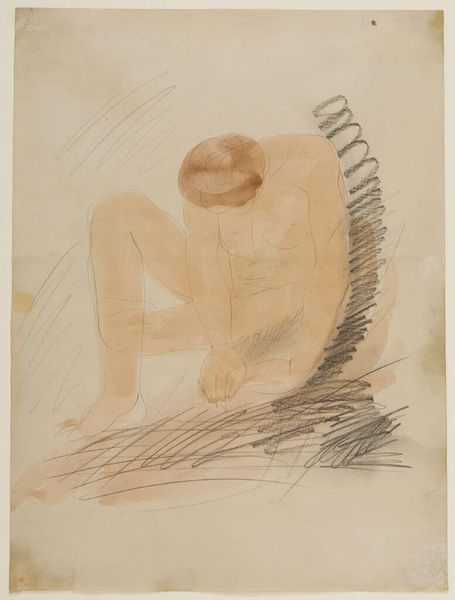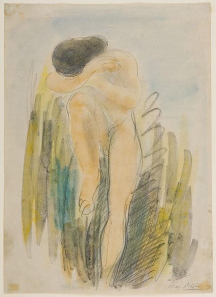 Curator: This watercolor, "Standing Female Figure Leaning Back," is attributed to an imitator of Auguste Rodin. It's currently held at the Harvard Art Museums. Editor: The figure seems to float, ethereally balanced between water and sky. There's a melancholy to her pose, a yielding to some unseen force. Curator: Rodin's influence is clear in the figure's expressiveness. He often explored the body's capacity to convey emotion, and this work seems to echo that concern with inner states. Editor: Perhaps, but Rodin's figures exude a certain strength, a groundedness. This figure appears vulnerable, almost dissolving into her surroundings. The watery medium suits that quality. Curator: Water has long been a symbolic element, often linked to subconscious depths and fluidity of being. Editor: It's interesting how imitations often inadvertently reveal the core essence of the original artist while simultaneously being unable to fully embody it. It's like a historical echo. Curator: Yes, the history embedded in this image extends beyond the mere question of authorship. It speaks to Rodin's lasting impact on the representation of the human form. Editor: It's a delicate dance between presence and absence, and this piece certainly invites us to consider the nuances of artistic influence.