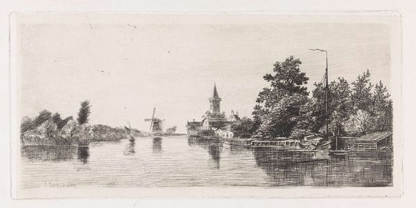 Editor: This pencil drawing, "Stadswal met kerk en molen," meaning "City Wall with Church and Mill," is attributed to Aarnout ter Himpel, dating somewhere between 1644 and 1686. It's rendered in delicate greys and whites. What strikes me most is how serene and contained the cityscape seems. How do you interpret the presence and placement of these iconic Dutch symbols—the church and the windmill—within this townscape? Curator: Indeed, the church and windmill aren't simply architectural features; they're potent emblems in the visual vocabulary of the Dutch Golden Age. The church often symbolizes spiritual life and communal values, while the windmill represents progress and human innovation harnessing natural power. This coupling reflects a balance and tension. How does the water element in the foreground influence the reading of this symbolism? Editor: I hadn't considered that. The water seems to both separate and connect the viewer to this community. It reflects the scene, blurring the lines between the real and the reflected. It suggests a kind of liminal space...a transition, maybe? Curator: Precisely! Water often functions as a symbol of transition, change, and even the unconscious. Given the historical context, this could allude to the Netherlands' own navigation through periods of religious and political change, finding stability by harnessing tradition and embracing progress. What other elements do you feel might carry symbolic weight here? Editor: I think the horses on the boat stand out, they are actively involved in the movement. Also the absence of many people. They’re rendered very simply, but it suggests their vital, daily role in keeping the town moving, literally and figuratively. The lack of population adds to the stillness and solitude feeling to the image. Curator: Excellent observations! Seeing these common visual themes interwoven helps us glimpse the worldview of the time, echoing in our cultural memory today. Editor: I see it. The cultural memory of these images reinforces their significance over time. Thank you, this was truly insightful!