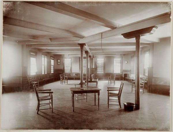 Curator: Let's consider this intriguing image titled "Recreatiezaal," taken around 1902 by Tan Tjie Lan. It’s a photographic study of what appears to be a recreation room. What’s your initial reaction to the piece? Editor: It’s incredibly still…almost eerily so. Like a ghost caught mid-game. The light reflects strangely on the tiled floor, creating an otherworldly effect, and for a recreational space, it lacks life. There's a sense of waiting, of expectation unfulfilled. Curator: I see that. There is a tension. The recreation hall depicted seems very formal. If you look at the architecture, you will observe this. In Dutch colonial contexts, social spaces for recreation or recuperation played an important role in the hierarchies that emerged there. The precise framing suggests more of a documentary impulse than a truly “recreational” feel. Editor: The rigidity is so evident. And is it just me, or does the emptiness amplify that? Each chair is neatly arranged; it's so orderly it could be staged. It almost seems less like a lived-in room, and more like a set piece, the opening scene in some melancholic play. Curator: That interpretation isn't unfounded. Photography then often functioned within colonial projects—mapping, surveying, documenting not only territories but also behaviors and rituals. Who was invited to these places of 'recreation'? These settings were tools for creating specific social conditions that upheld a power structure. Editor: Power struggles are certainly visible when you study the rigid symmetry. The tables neatly aligned as if arranged for inspection... It really brings up that sense of imposed order over natural interaction, a space regulated more than enjoyed. Like a metaphor for social engineering caught in silver halide. What lingers is the silence—a testament, maybe, to unspoken control. Curator: Exactly. Looking at "Recreatiezaal," we confront the complex legacy of Dutch colonial Indonesia. It provides critical insight into how leisure, race, and class became intertwined under colonialism, offering us a stark look into the curated landscape of a bygone social order. Editor: Leaving me haunted, though in an interesting way. You know, I love those works that continue to engage you long after you move away, like lingering spirits in a quiet room.