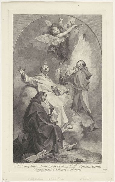 This is Cornelis Bloemaert's engraving, "The Vision of Saint Ignatius of Loyola," created sometime between 1603 and 1684. It reflects the intense religious environment of the 17th century, marked by the conflicts of the Reformation and Counter-Reformation. Bloemaert situates Ignatius, the founder of the Jesuit order, in a moment of divine revelation. We see Jesus, bearing the cross, accompanied by God the Father, and a multitude of angels. Ignatius kneels, embodying humility and devotion, his gaze fixed on the vision. The engraving vividly conveys the intense spiritual experiences that were central to the lives of religious figures. Bloemaert’s work served not only as a devotional image but also as a powerful statement of faith, reinforcing the doctrines of the Catholic Church amidst religious and political upheaval. It invites us to reflect on the intersection of faith, power, and personal experience during a tumultuous period in European history.