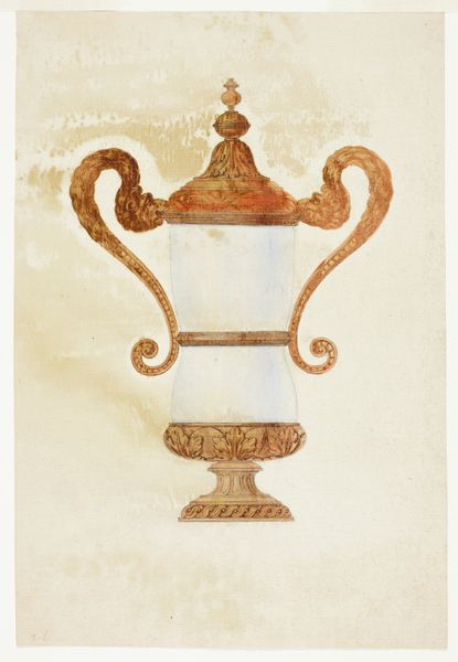 Curator: Here we have "Rosewood Vase," a drawing created around 1936 by Sebastian Simonet, crafted using colored pencils. What's your immediate reaction to this piece? Editor: Immediately, I'm struck by this odd mix of austerity and grandeur. The color palette is muted, but the vase itself has such a dignified, imposing presence, almost as if it’s posing for a portrait. It makes me think of an ancient, weathered monument—perhaps slightly worn with age. Curator: That's insightful. Simonet was indeed part of a generation grappling with the aftermath of World War I and the rise of industrialization. There's a deliberate return to classical forms here, but filtered through a distinctly modern lens. Note the flattened perspective, which aligns with design trends popular at that time. This imagery connects back to idealized, even imagined histories. Editor: I love that—"imagined histories." It does have a bit of theatrical flare to it. Almost feels like the artist unearthed some treasure and is presenting it to us, the public, on display. Although the vase's shape, I find quite intriguing too... Curator: Indeed, its form is particularly striking and typical of classic Greek urns, frequently linked with memorials and remembrance. This vase stands divorced from any setting in its simplicity of construction, as well as isolated by the background surrounding it, lending to it a detached aura that allows viewers a degree of individual interpretations. Editor: I'm finding that feeling too now...almost like staring at a stage prop. Maybe a play where everyone already knows their part but doesn’t know when the curtains are going to close on their scene. Melancholy then? Curator: Well, to see this, let’s remember that, art and design in the 1930s often served as propaganda tools. Representing stability and order through classically inspired forms served as implicit messages. The neutrality could have been intended. Editor: Fair point. Art isn't produced in a bubble. Okay, I concede... while the vibe I’m getting may seem mournful and bleak, it might’ve intended a calming serenity as this was constructed against uncertain futures during the age. Still, beautiful work. Curator: Absolutely. Considering the historical context coupled with Sebastian's skill as an artist adds profound depth to a still object. Editor: So very true; it’s more than "just a vase", wouldn't you say?