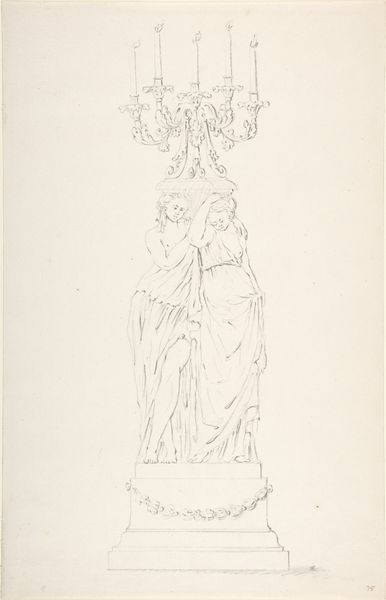 Editor: This is an intriguing sketch, a "Design for a Candelabra" dating back to somewhere between 1765 and 1795. It's a pencil drawing, seemingly intended for a print. The draftsmanship has an appealing ethereal quality. What do you see in this piece, looking at its visual construction? Curator: The immediate observation pertains to line quality. Note the contrast between the fluid, almost weightless lines describing the drapery of the figures and the comparatively firm, descriptive lines used for the candelabra elements themselves. Are these lines unified, or are they separate formal constructions sitting alongside each other? Editor: It seems to me the candelabra forms a distinct, heavier presence above, yet I do feel a connection in the drawing's theme overall... the sketch still retains an overall decorative elegance. Do you see any tensions at play? Curator: Indeed, a key tension resides in the application of line to denote form versus decoration. Observe how the stylized figures are rendered; the lines do not precisely delineate musculature but create flowing planes suggesting classical forms. Contrast this with the more precise, almost technical linework in the base. Is this a synthesis or a juxtaposition? Editor: Perhaps it is both? The juxtaposition highlights the different elements, but it is the overall neoclassical aesthetic that holds them together? It's fascinating how analyzing the linework alone opens up this discussion. Curator: Precisely. Formal analysis illuminates the interplay between technique, aesthetic intention, and cultural context, all without resorting to biography or external narratives.