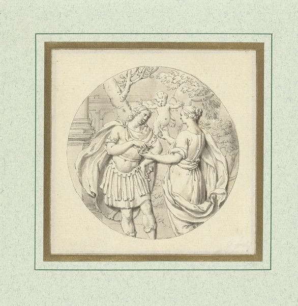 Curator: Here we have "Time Displaying the Understanding of Things to the Allegory of Truth", a watercolor drawing made around 1715 to 1718 by Arnold Houbraken, currently held at the Rijksmuseum. Editor: The cool tones evoke a sense of serious reflection; yet there is an intimacy in the aged man guiding the young winged figure. It suggests a dialogue, a passing down of knowledge, maybe. Curator: Exactly. Compositionally, it is quite sophisticated. Observe how the artist used an oval frame within the rectangular format. This contrast introduces layers, almost like peering into another dimension where allegorical figures preside. Note the interplay of the drapery behind and their placement upon an earth-like orb; how would you say that communicates meaning? Editor: It places “understanding” literally on the world stage, as something negotiated and constructed, not simply revealed. The figure of Time, often gendered as male, displays an awareness in a mirror while engaging in active learning with a likely angel personifying “Truth”. This potentially complicates gender and aging dynamics; is wisdom accessible without patriarchal tradition or awareness of social and subjective reality? Curator: Certainly, the mirror alludes to the reflexive nature of knowledge, as well as historical conventions, perhaps. I see more classical symbolism though, linking form to subject matter; Houbraken clearly draws inspiration from earlier masters by focusing on line and balanced geometry. Look at how he renders the folds in Time’s robe with sharp lines and tonal modeling! Editor: I think there’s also a self-awareness in the way Houbraken positions his work. Born in Dordrecht during the Dutch Golden Age, his own experiences with the transition from tradition to modernity deeply affect his subjects as a commentator of life, truth, time, understanding, and their interconnectedness. Curator: I concur, in these renderings and allegories one feels the artist considering and reconsidering themes of transformation through the passing of time. Editor: Ultimately, Houbraken's allegory reminds us of the relational nature of wisdom, requiring both reflection and engagement with those we might not expect, even allegorical forms of truth.
