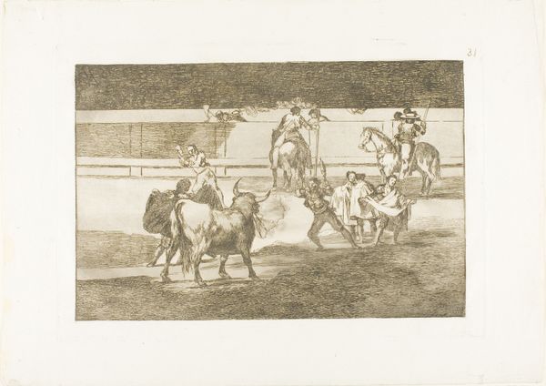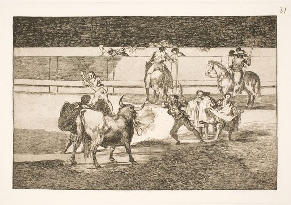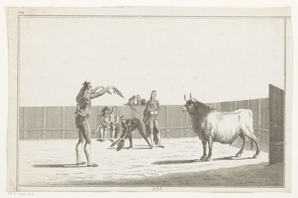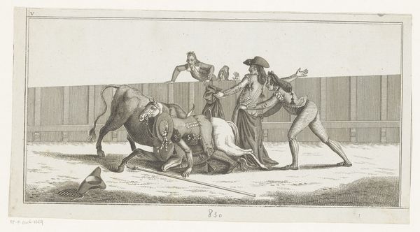 Curator: The focus of this image, an engraving called "Bull Attacked by Dogs" from after 1790, seems to be violence and spectacle, what do you observe? Editor: It's striking how dynamic it is for a print. You see the bull tossing a figure, the dogs in mid-lunge... It feels incredibly dramatic. What strikes you most about it? Curator: I’m particularly interested in the means of production, and how an image like this circulated. Who was the intended audience, and how did the engraver's labor translate the drama of a bullfight into a commodity? This isn't just about aesthetic representation, it's about the systems of patronage and consumption that supported this kind of artwork. Do you notice how the linear quality is really well executed here? Editor: Yes, the line work creates the illusion of movement really well, especially for an engraving. I’m wondering though, were prints like this purely for entertainment? Curator: Not entirely. The violence might be titillating, but think about the context: the ritualistic spectacle of the bullfight, the social hierarchies reinforced by it, the economic networks sustaining it. An image like this allows the upper class to revere a practice that relies on lower class people. We see how "high art" isn’t detached from brutal realities or production that required great effort. What do you think the symbolism suggests? Editor: That’s fascinating, I hadn't thought about it that way. I guess seeing the artwork framed as an item of consumer culture is challenging. Curator: It forces us to confront how art reflects and perpetuates societal structures and also consider who had access to these images. I guess that the labor, materials, and underlying economics cannot be disregarded. What have you found to be of value in our reflection about this print? Editor: I'll definitely be thinking more critically about the means of production and the social context. Curator: And hopefully, this way of looking will open further possibilities of analysis for your experience.