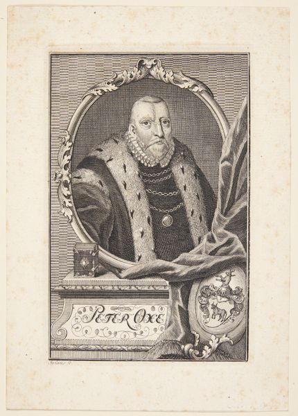 Johann Christoph Sysang created this portrait of Peder Oxe using engraving techniques. The portrait is framed within an oval, its ornate border contrasting with the grid pattern in the background. Oxe, adorned in elaborate garments, exudes authority. Sysang masterfully uses the engraving medium to convey texture and depth. Notice how the varying densities of lines create a rich tonal range, from the deep blacks of Oxe's coat to the subtle grays of his face, all achieved through the strategic arrangement of lines. The contrast between the detailed foreground and the simple background flattens the space, drawing attention to the subject's presence. The portrait's composition reflects a structured representation of power, yet the deliberate flattening of space destabilizes traditional hierarchies of representation. The formal elements work to convey a sense of controlled, yet ambiguous authority, inviting ongoing interpretations of power and identity within the semiotic system of portraiture.