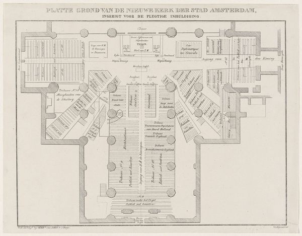 Editor: This is "Platte Grond van de Nieuwe Kerk…", an engraving from 1849, offering a detailed floor plan of the New Church. It feels incredibly formal, almost like a blueprint but with these flourishes. What historical details jump out at you from this piece? Curator: Ah, yes! A bird’s-eye view into a pivotal moment. It is so deeply evocative; I can almost hear the hushed whispers and rustling silks of those attending King Willem III’s inauguration! The rigidity of the Neo-classical architectural plan contrasts brilliantly with the imagined flurry of attendees on that very day. I imagine the architect, J.C. Boom, carefully considers every spatial element, likely pondering, 'How does this design not just house, but also *enhance* the solemnity of the event?' Editor: So, it’s not just about space; it’s about creating an atmosphere. Curator: Precisely! It is about imbuing a space with power, prestige, and, dare I say, a touch of theatricality. Do you notice how the layout seems almost like a stage set? Every area is carefully delineated, hinting at prescribed roles and viewpoints within the ceremony. Even a simple floor plan transforms into a cultural record. It's funny – seeing this makes me think about my own presence at inaugurations – where did *I* fit in the architecture? Editor: I see that! Thinking about it as a 'stage set' really brings it to life. Curator: It’s remarkable how much history and human intention can be contained in an apparently simple engraving. Editor: This has completely shifted my perspective on what an architectural print can convey; more than just construction, it shows us ceremony. Curator: Precisely! It reminds us that spaces are not just empty vessels; they are living containers of stories and emotions.