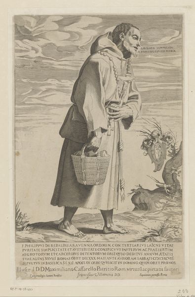 Editor: Here we have Francesco Villamena’s 1600 engraving, "Bedelmonnik Giovanni Leonardo Geruso." It's fascinating, isn't it? The figure seems to be emerging from the page, a kind of ghostly image. What draws your attention in this composition? Curator: Indeed. The figure dominates. But consider the intentionality behind this portrayal. The work emphasizes the inherent qualities of line and form. Notice how Villamena uses hatching and cross-hatching, deploying a sophisticated use of light and shadow to define the subject. Editor: I see what you mean about the technique. All those fine lines creating depth and texture are intriguing. But is it just about the lines? Curator: Not merely the lines themselves, but how those lines construct a semiotic language. Observe the intentional roughness – the almost caricatured rendering of the main figure. Are we to consider this figure heroic? The rendering evokes an aesthetic of unidealized reality – or, more precisely, the illusion thereof. Do you find any tension in this visual language? Editor: A tension, yes! It’s like a dance between realistic detail and, almost, a symbolic representation. Curator: Precisely! The composition employs stark contrast to draw the eye, creating a dialogue within the picture plane. One cannot overlook that compositional element and the interplay of texture within it. The figures form a story of shape and space. What are your final thoughts regarding this? Editor: This conversation gave me a totally different viewpoint. I now see that, the form and structure create the whole picture. Thanks! Curator: The formal relationships dictate, in essence, our understanding of the piece, which in turn gives the engraving meaning.