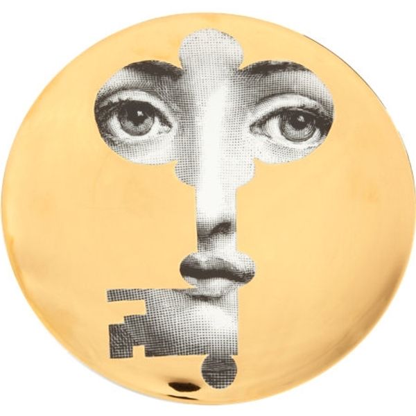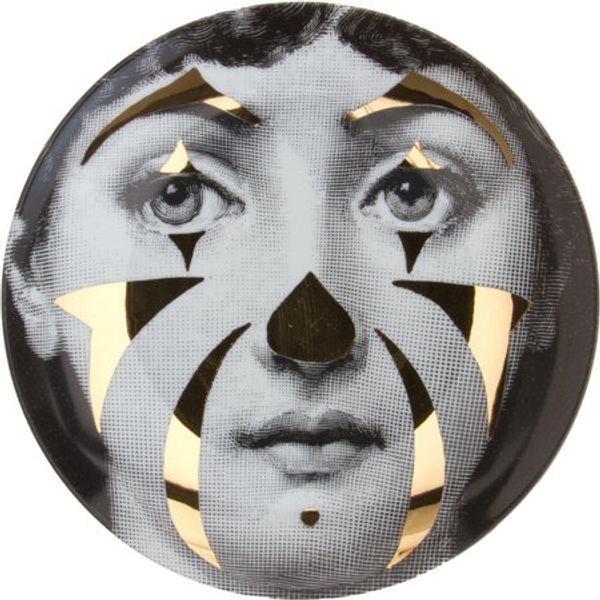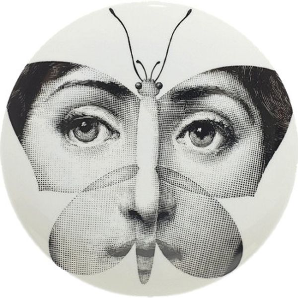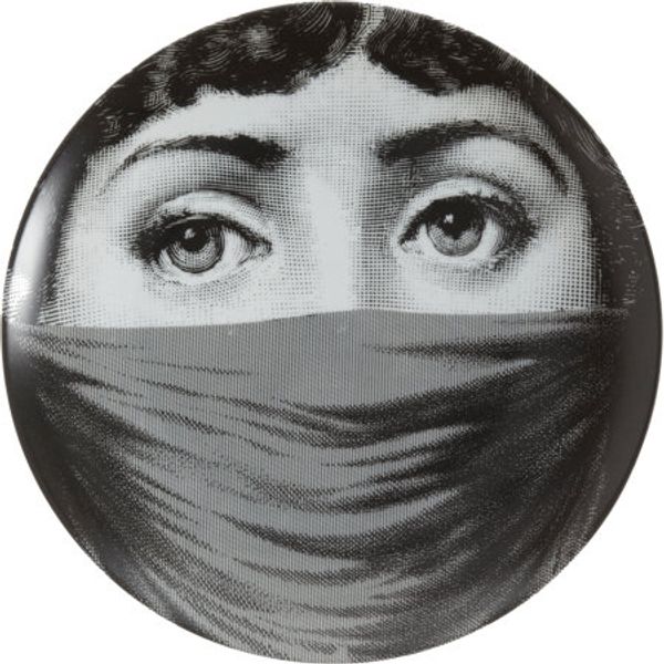 Editor: This is "Theme & Variations Decorative Plate #334 (Woman With Finger on Lips)" by Fornasetti, and it's particularly striking in its graphic simplicity. The image is powerful, yet it’s printed on something as mundane as a decorative plate. What do you make of that? Curator: It's precisely that tension that's key. By placing what resembles a classical portrait onto mass-produced tableware, Fornasetti interrogates the hierarchies between ‘high’ art and everyday objects. Consider the plate itself – porcelain, often machine-made, available for consumption. The image, regardless of its original source, is thus rendered a commodity. Editor: So you're saying it's about the materials and production devaluing the art? Curator: Not necessarily devaluing, but definitely re-contextualizing. Think about how the printing process affects our perception of the portrait. Is it a comment on reproducibility and the deconstruction of aura, akin to Warhol's screenprints? What’s lost or gained when something so individual is transferred to a functional, manufactured object? Editor: That’s interesting. I hadn’t thought about it that way, about how the means of production change our understanding. It makes you wonder what the significance of putting this on a plate is. Is it meant to be consumed literally or figuratively? Curator: Exactly! Fornasetti, by using industrial techniques and humble materials, invites us to question the art object's position within consumer culture. Editor: I'll never look at a decorative plate the same way again! I'm much more aware of the choices, labor, and statement the materials represent now.