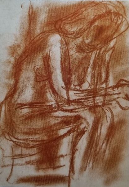 Curator: Up next we have a somewhat brooding nude figure executed in charcoal, titled "Nude Sitting, 1935" by Bela Czobel. What are your initial thoughts? Editor: I find the figure’s obscured face intriguing. It evokes a feeling of anonymity, as if the sitter’s individual identity is less important than the universal experience of the human form. The warm earth tones also create a sense of intimacy despite the absence of distinct facial features. Curator: That anonymity might reflect broader anxieties within interwar art. Czobel and his contemporaries, many impacted by the upheaval of WWI, used figuration not necessarily to portray individuals but to reflect collective experiences of displacement and the changing perception of the body in the face of social distress. Editor: Interesting point. Formally, I notice how the strong diagonals of the figure’s arms and legs create dynamism within a very confined space. The artist seems to be using the boundaries of the paper almost as a theatrical proscenium for the display of the seated body. Curator: Indeed. Moreover, Expressionism like this, born from anxieties related to the early twentieth century industrialization and alienation, challenged the prevailing aesthetic norms of the time, and in the interwar years gained renewed momentum through being viewed by critics, politicians, and subsequently collectors as representative of modern spirit and vitality. Editor: The deliberate rawness of the charcoal lines enhances this emotionality, contributing to the Expressionistic quality you mentioned. There’s no attempt to idealize the figure, embracing the human body in its most unfiltered state. Curator: A crucial move within interwar Expressionism: to strip away artifice and explore emotional truth even in its most raw, confrontational forms. It was the age of rapidly democratizing ideas regarding class, social role and standing. Editor: That's an interesting observation, and helps contextualize Czobel's work as something not simply born of technical skill, but cultural significance. It is, if you like, an "honist" portrayal of how many humans feel internally as we grapple with daily modern concerns. Curator: Indeed, art becomes more than mere representation; it is an active participant in, and commentator on, societal discourse. I'll have to remember this one as well.