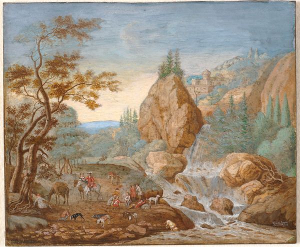 Art Historian: Here we have "Landscape with Shepherds and Cows and at the Spring" by Joseph Anton Koch. The piece seems undated, but is characteristic of his landscape work. Curator: It's incredibly serene. The composition, especially the positioning of the trees framing the scene, has a classical, almost stage-like quality. And those meticulously rendered cows - you can almost feel the weight and texture. I wonder about Koch's working methods; did he create studies of individual animals? Art Historian: That's a good question. He moved in Neoclassical and Romantic circles, advocating for a return to idealized nature. Koch was very influential. It is said he essentially established a German school of heroic landscape painting in Rome. Think of its market. The grand tour made antiquarian taste and art collecting a mark of class and culture. Curator: Precisely! It speaks to the labor involved in creating an ideal and its cultural consumption by elite patrons. Those oil paints are expertly blended to give us luminosity, but also an unachievable gloss on rural labour and the relation between man and animal. And think of the scale of it all – not just the physical size of the canvas, but the vast, implied ownership of the land and everything in it. Art Historian: Yes, and the presence of classical figures adds to the layers of historical references which further enrich the narrative that catered to a particular class and their educational background. This wasn't just a picture of a nice field! Curator: It shows the pastoral ideal as constructed and performed; something acquired and exhibited. Art Historian: Viewing it today, though, it raises questions about how we now perceive those constructed landscapes. Curator: Indeed, It’s a visually stunning artifact embedded in its socio-economic history, its very being defined by materials extracted and skills employed to uphold established social norms. Art Historian: Well, examining this landscape through its social, cultural, and historical context has revealed new perspectives about its impact. Curator: Agreed, I found it equally enriching to understand how production, class, and material context are all interconnected here.